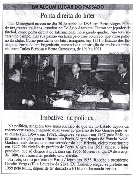 No último bloco uma curiosidade:  a participação do prefeito Ildo Meneghetti na solução da saída do Grêmio da Baixada dos Moinhos de Vento para a Azenha, onde o clube construiu o Estádio Olímpico.