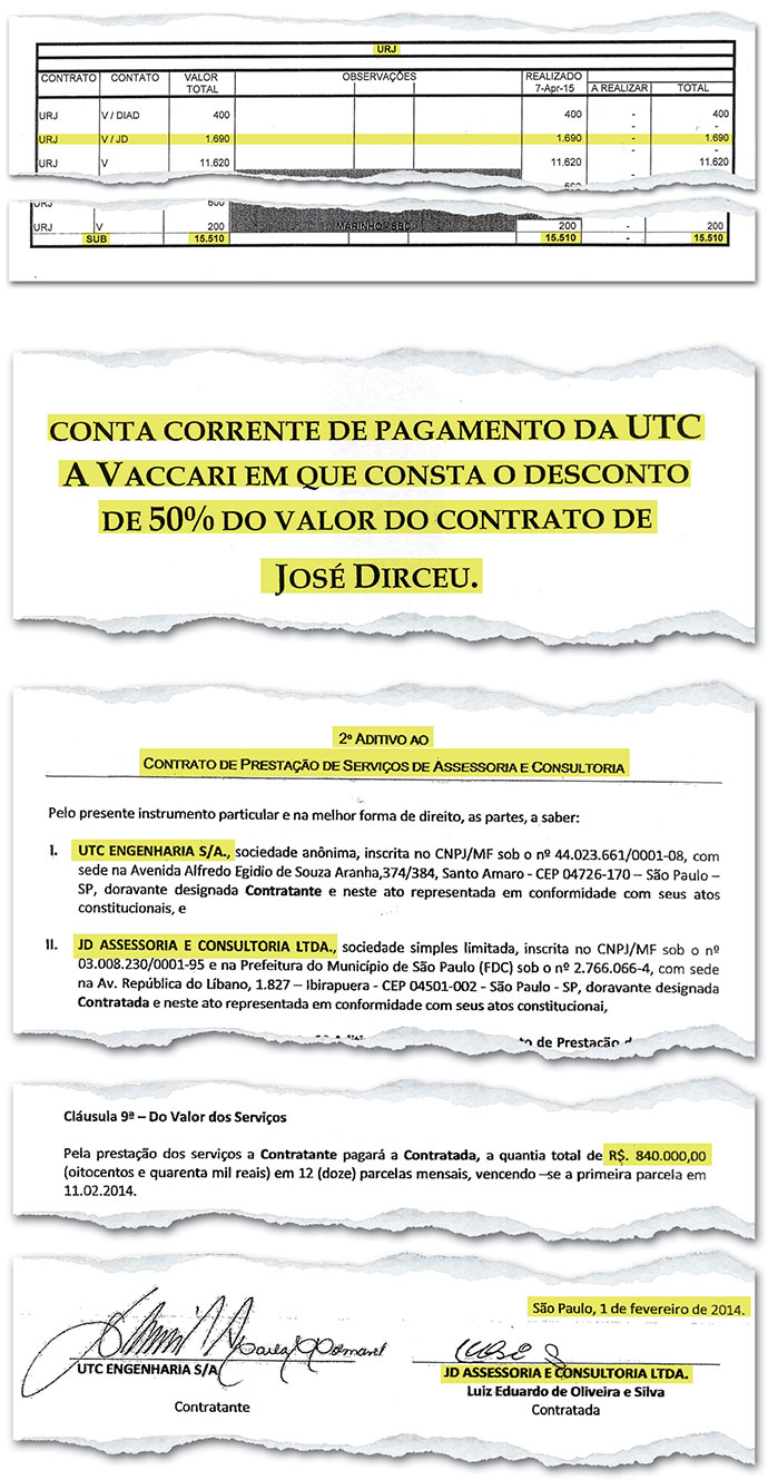 A única coisa que José Dirceu prospectou foram aditivos ao contrato. Sem nenhum tipo de serviço prestado, o consultor conseguiu mais 906 000 reais da UTC no ano seguinte. Quando a última parcela desse segundo contrato venceu, Dirceu já fazia parte da população carcerária do presídio da Papuda, em Brasília. Mas nem a prisão foi capaz de atrapalhar os negócios do ex-ministro. Ricardo Pessoa contou aos investigadores que, a pedido do próprio Dirceu, assinou um segundo aditivo, de 840 000 reais. O contrato foi firmado quando o mensaleiro já estava no terceiro mês de prisão. “Apenas e tão somente em razão de se tratar de José Dirceu e da sua grande influência no PT é que, mesmo sabendo da impossibilidade de ele trabalhar no contrato firmado, porque estava preso, o aditamento foi feito e as parcelas continuaram a ser pagas”, disse o dono da UTC aos procuradores. O mais impressionante: como a tabela acima comprova, metade do dinheiro pago pela UTC a Dirceu foi debitada com autorização de Vaccari da conta-corrente que a empreiteira administrava para o PT. Ou seja, o ex-ministro foi pago com propina da Petrobras.