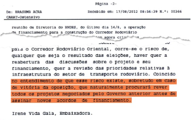 “para o Corredor Rodoviário Oriental [a obra que seria realizada], corre-se o risco de, qualquer que seja o resultado das eleições, haver quer a reabertura das discussões sobre o projeto e seu financiamento, quer a revisão das prioridades relativas à infraestrutura do setor de transporte rodoviário. Coincido no entendimento de que esse risco existe, sobretudo em caso de vitória da oposição, que naturalmente procurará rever todos os projetos negociados pelo governo anterior antes de assinar novos acordos de financiamento. Irene Vida Gala, embaixadora”.