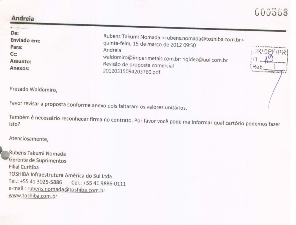 No local, foram obtidas ainda cópias de dois e-mails trocados entre outro executivo da Toshiba, Rubens Takimi Nomada, e Waldomiro Oliveira – laranja de Youssef na empresa Empreiteira Rigidez.