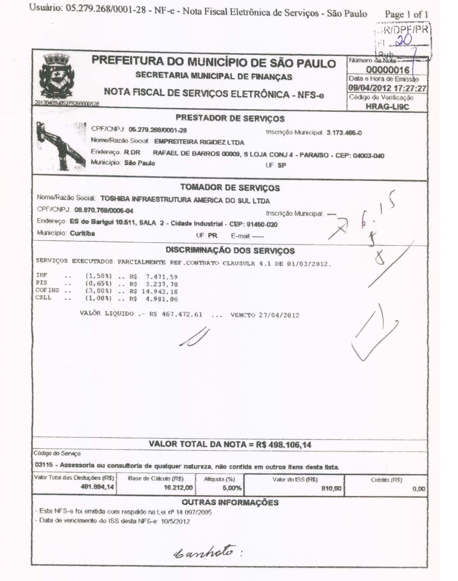 No material, que faz parte do inquérito aberto em janeiro tendo como alvo o negócio da Toshiba, há três notas fiscais emitidas pela Empreiteira Rigidez contra a Toshiba, totalizando R$ 1.494.318,42.